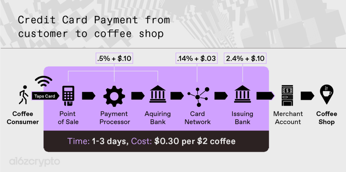 每当顾客在咖啡上花费 2 美元时,只有 1.70 到 1.80 美元进入咖啡店,剩下的近 15% 则支付给了信用卡公司——仅仅是为了促进交易。但在这里,信用卡只是为了方便:无论是消费者还是商店,都不需要那些为费用辩护的附加功能。消费者不需要欺诈保护(他们只是买了一杯咖啡)或贷款(咖啡只需 2 美元)。而咖啡店对合规和银行集成的需求有限(咖啡店通常使用综合的餐厅管理软件或根本不使用)。因此,如果有一种便宜、可靠的替代方案,我们可以预期这些企业会利用它。