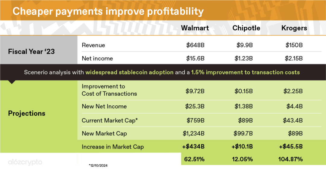 更广泛的稳定币采用将显著提高许多企业的盈利能力——不仅限于像咖啡店或餐馆这样的小企业。让我们看看三家上市公司的 2024 财年财务状况,以估算将支付处理费用降低到 0.1% 的效果。(为了方便起见,此评估假设企业支付 1.6% 的混合支付处理成本,并且上下通道成本最小。更多信息如下。)