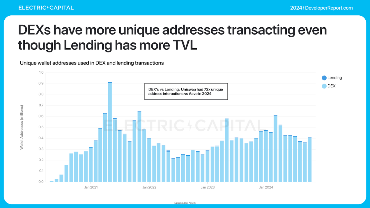 TVL并不是了解DeFi使用情况的唯一指标。尽管借贷的TVL多出3倍,但DEX拥有更多用于交易的唯一地址。