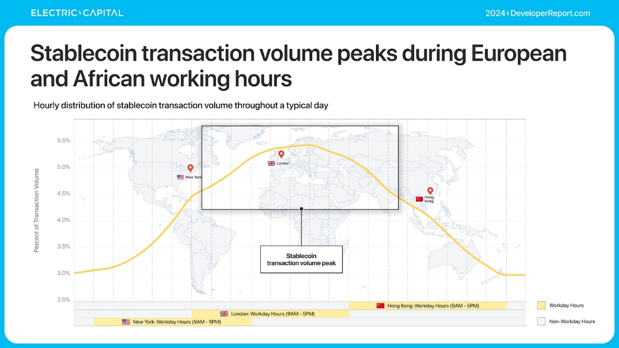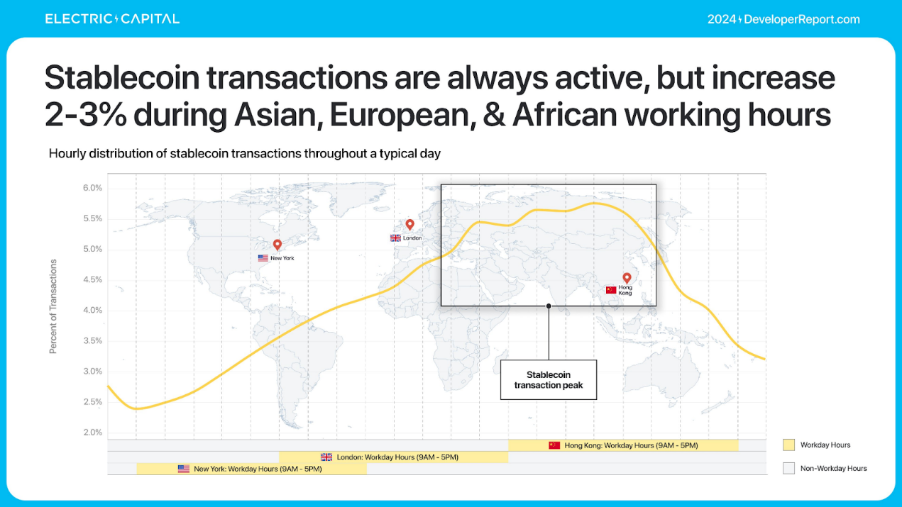 尽管稳定币交易在东部时间达到峰值,但交易量更多地偏向西方。