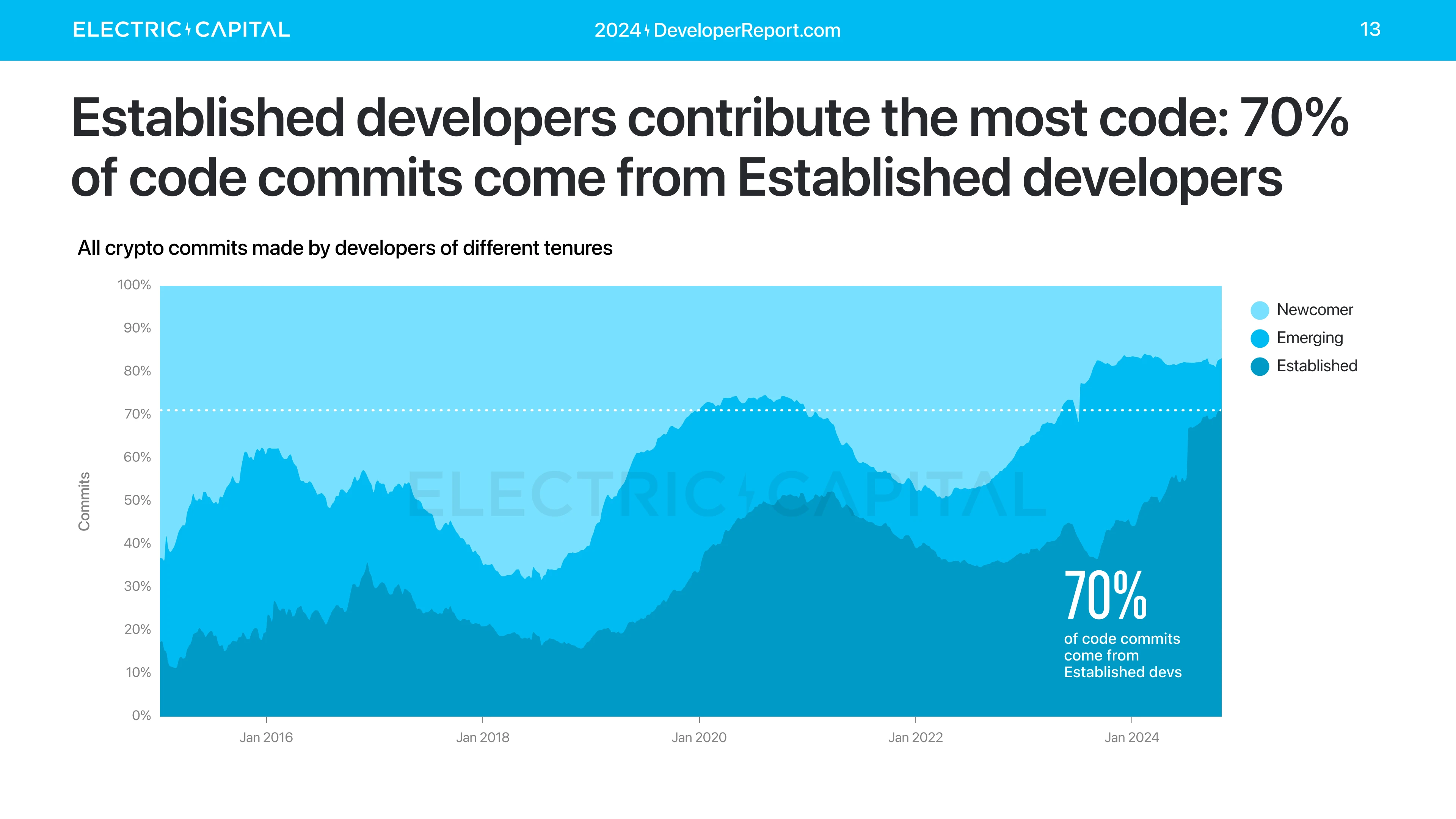 月活跃开发者数量去年略有下降,下降7%。从事加密行业2年以上的开发者数量增长了27%。这些资深开发者推动了行业的发展,因为他们贡献了70%的代码提交。