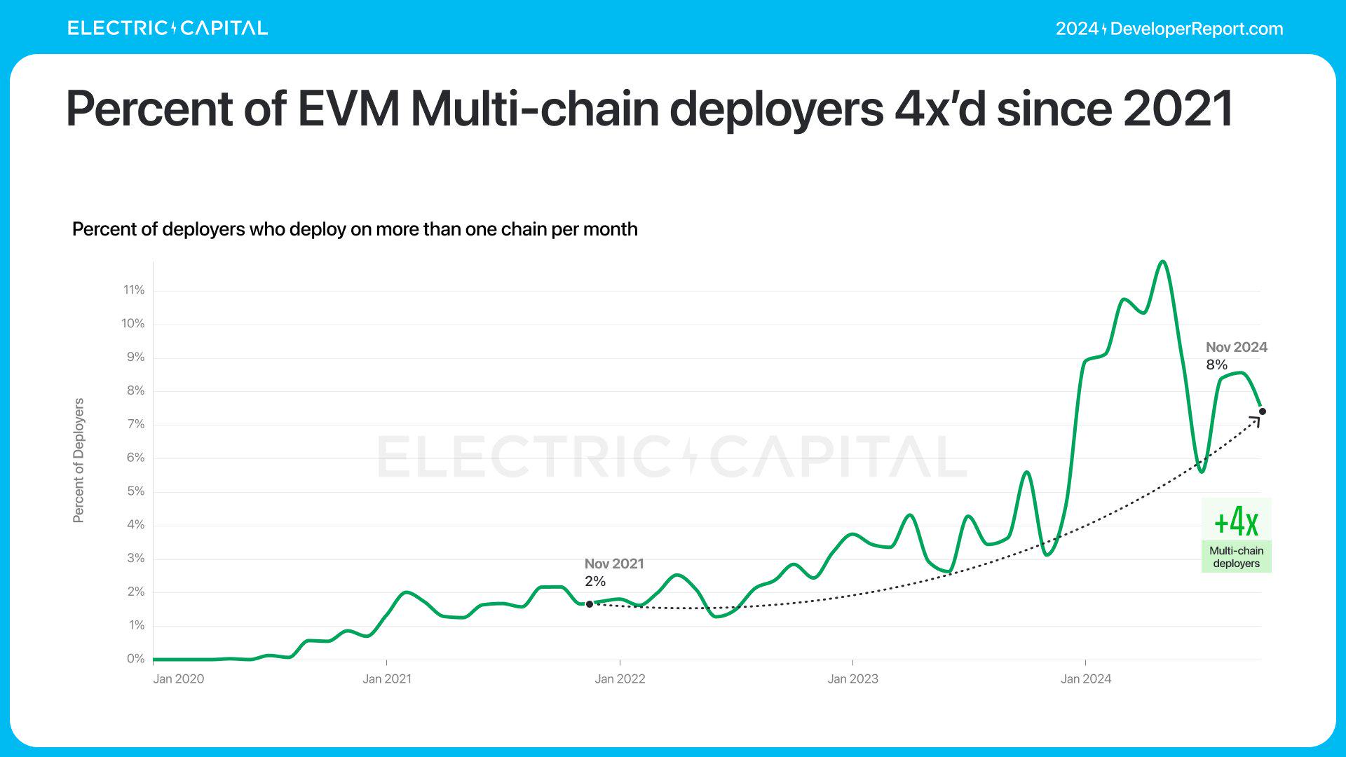 许多开发者都在多条链上工作。如今三分之一的加密开发者都在多条链上工作,并且这一数字还在不断增长。
