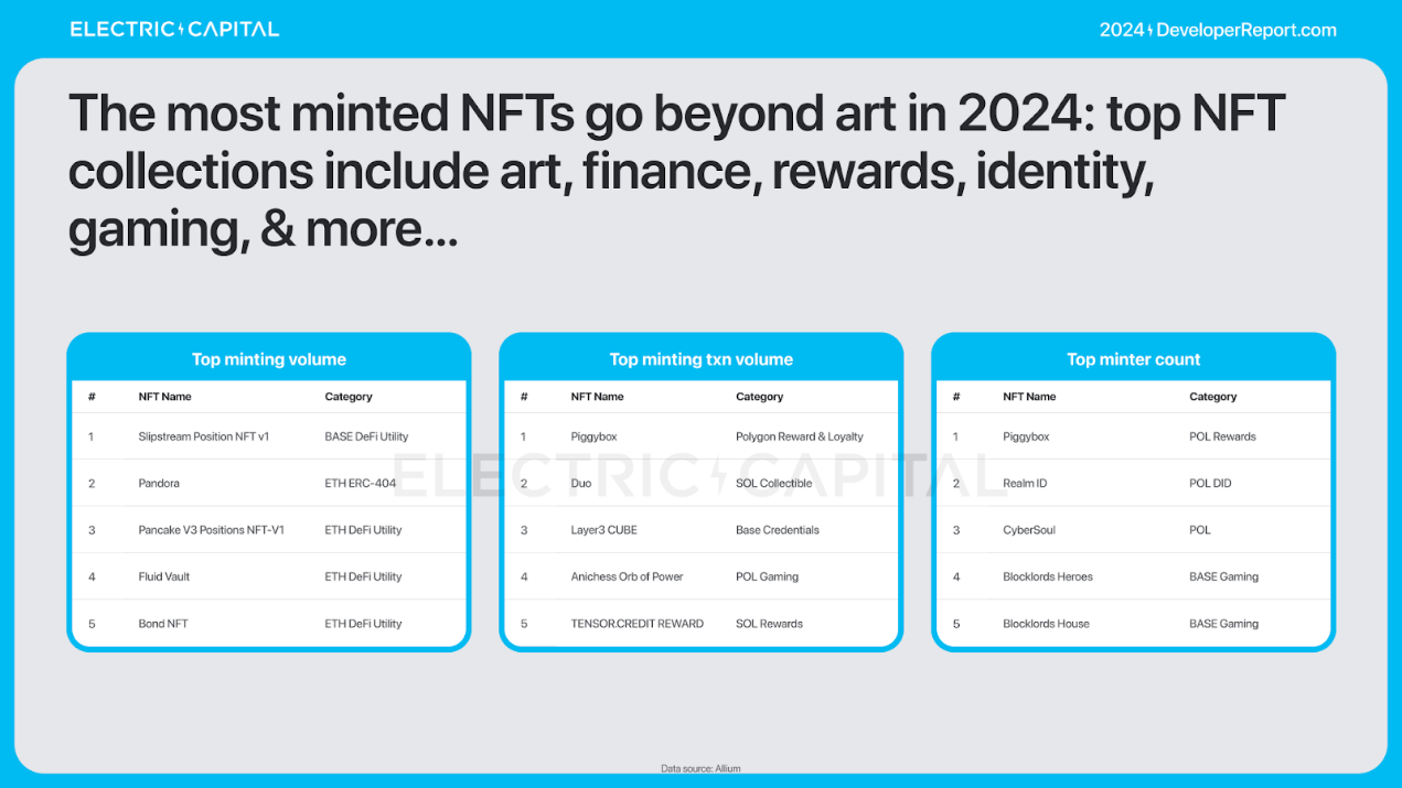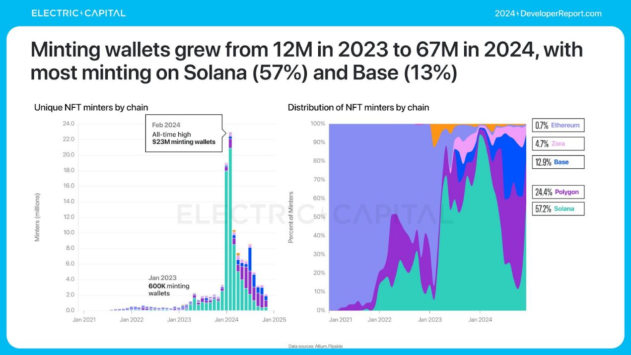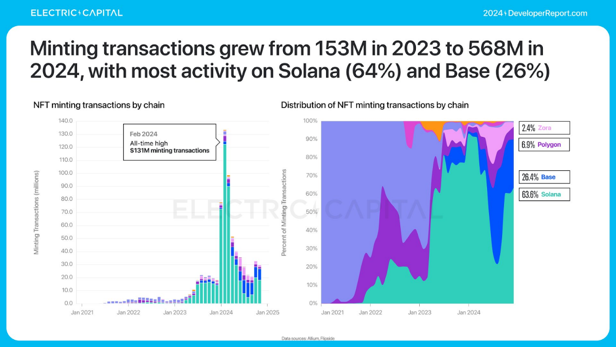 NFT铸造在2024年创新高,其中97%发生在Base上。Solana拥有57%的铸造钱包,并占据64%的铸造交易。由于NFT在2024年远超艺术品范畴,因此铸造活动有所增加。