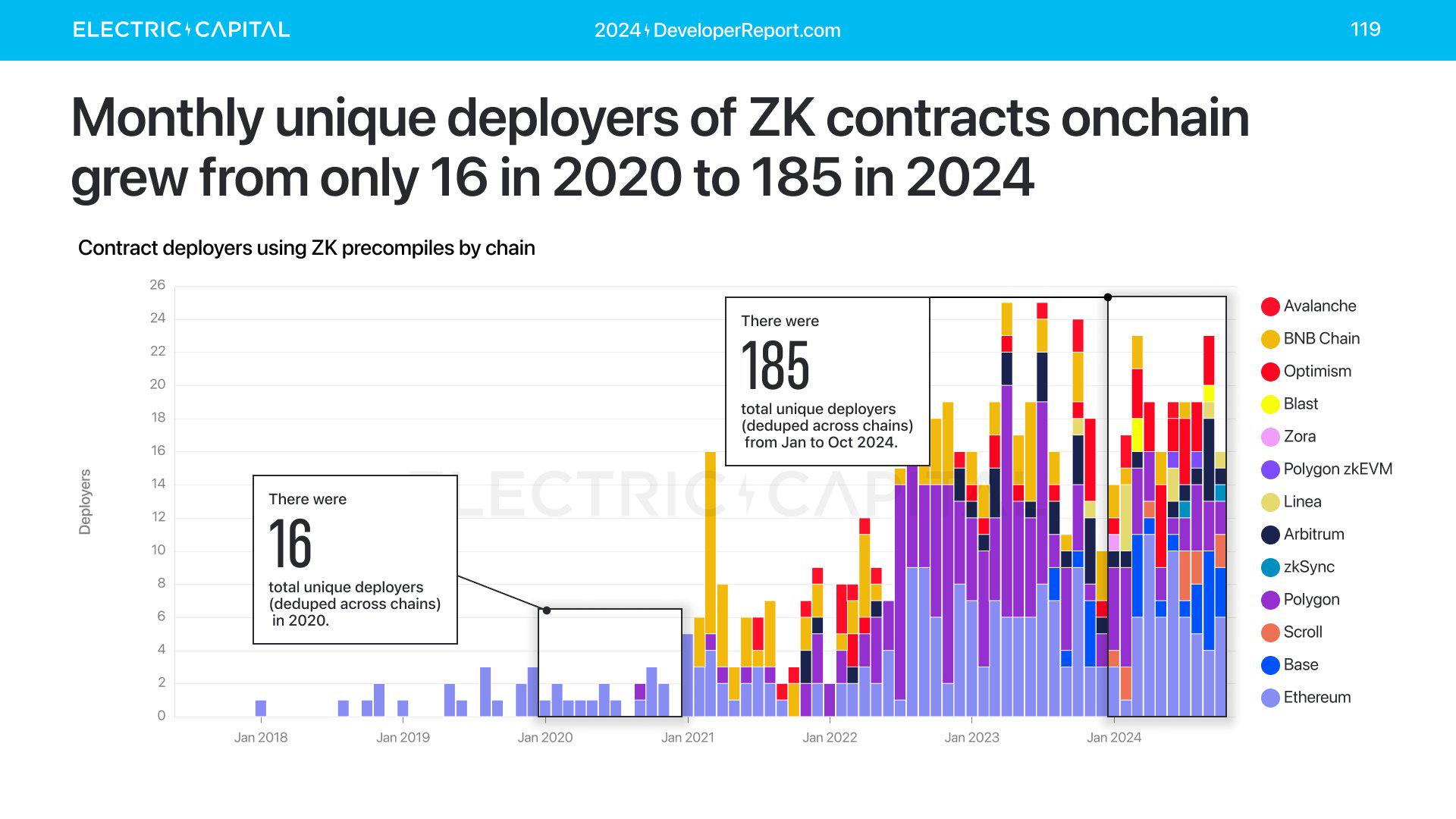 ZK链上部署也从2020年的40个增长到2024年的639个。数量不多,但增长明显。部署者数量也在增加。