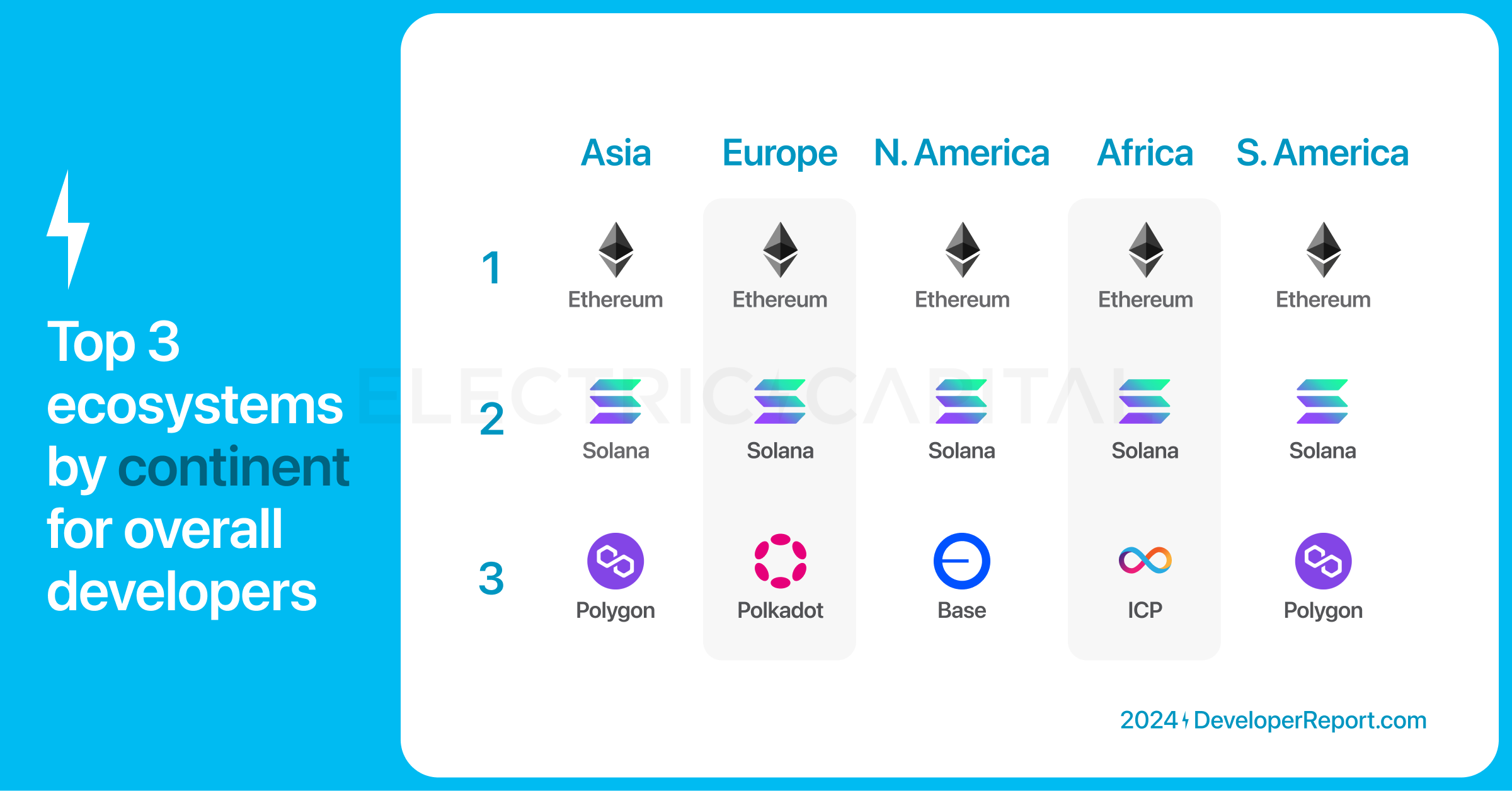以太坊是各大洲开发者份额排名第一的生态系统,Solana排名第二,Polygon在亚洲和南美排名第三、Polkadot在欧洲排名第三、Base在北美排名第三、DFINITY在非洲排名第三。