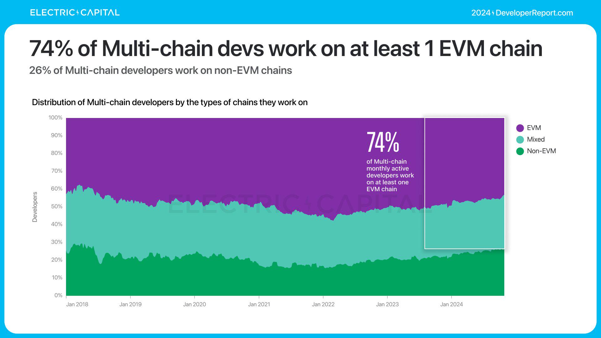 EVM链共享最多的开发人员,并具有显著的网络效应:74%的多链开发者在EVM链上工作。自2021年以来,EVM跨链部署者的比例增加了4倍。