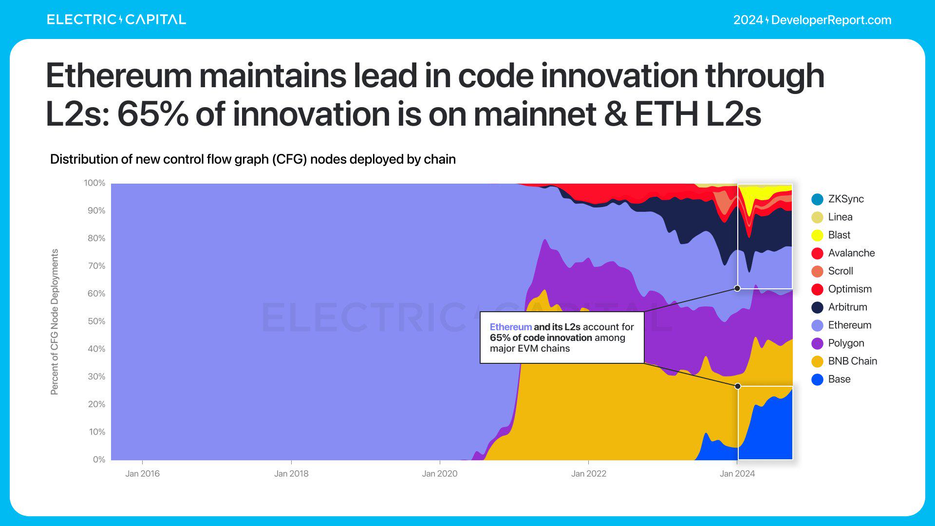 这就是以太坊生态系统如何通过L2s保持其在代码创新方面的领先地位。65%的创新发生在主网和ETH L2s上。