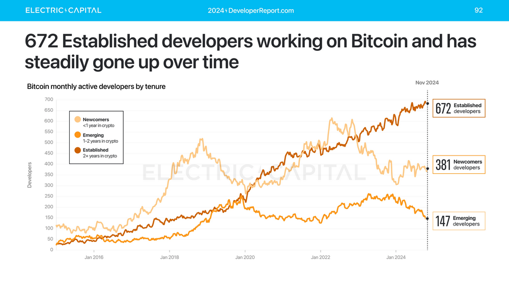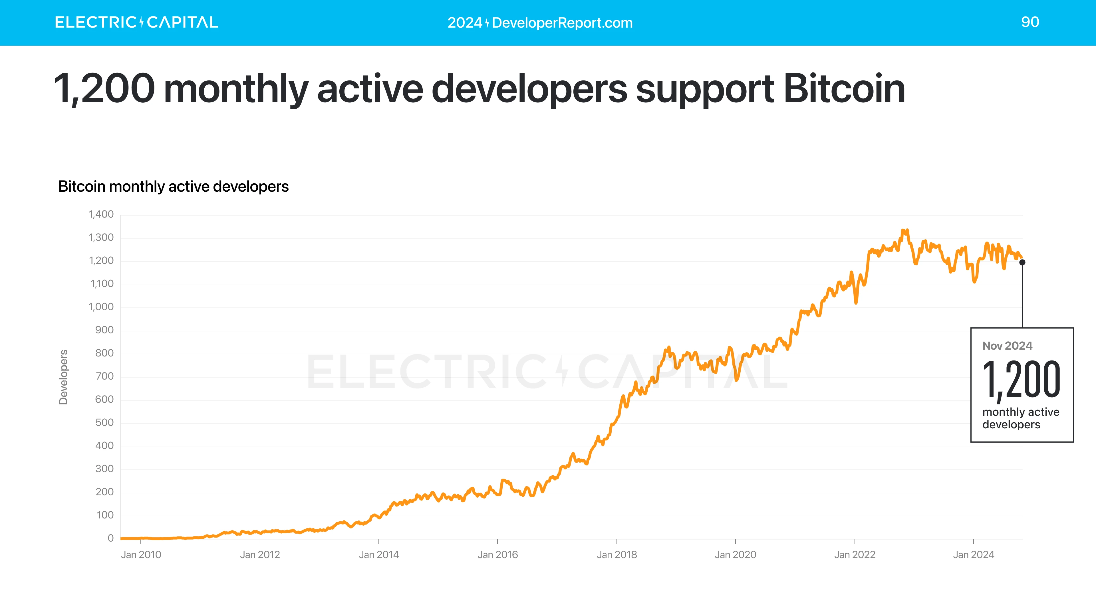 Bitcoin每月有1,200名活跃的开发者,2024年保持不变。