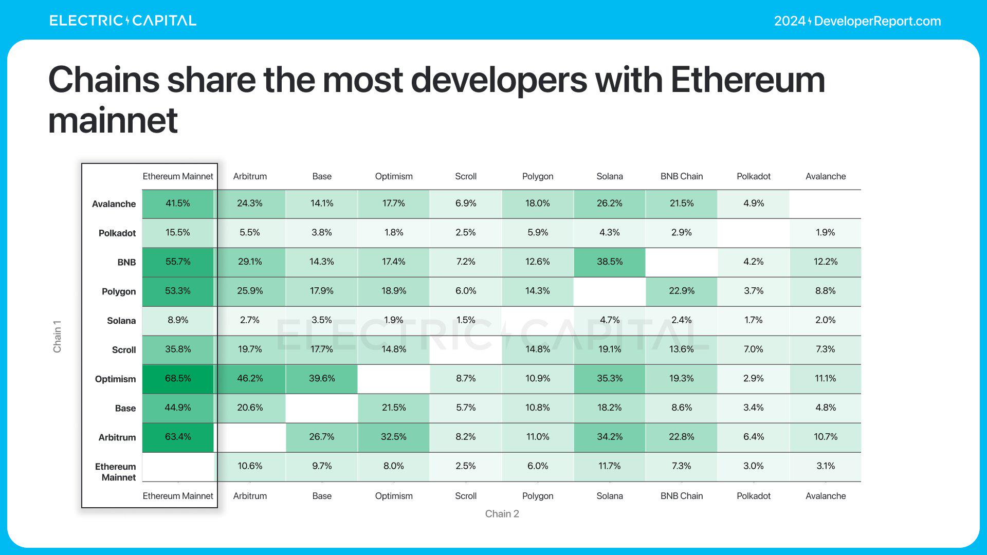 每月多链开发者的比例从2015年的不到10%增加到2024年的34%。多链开发者份额最大的链与以太坊共享开发者。