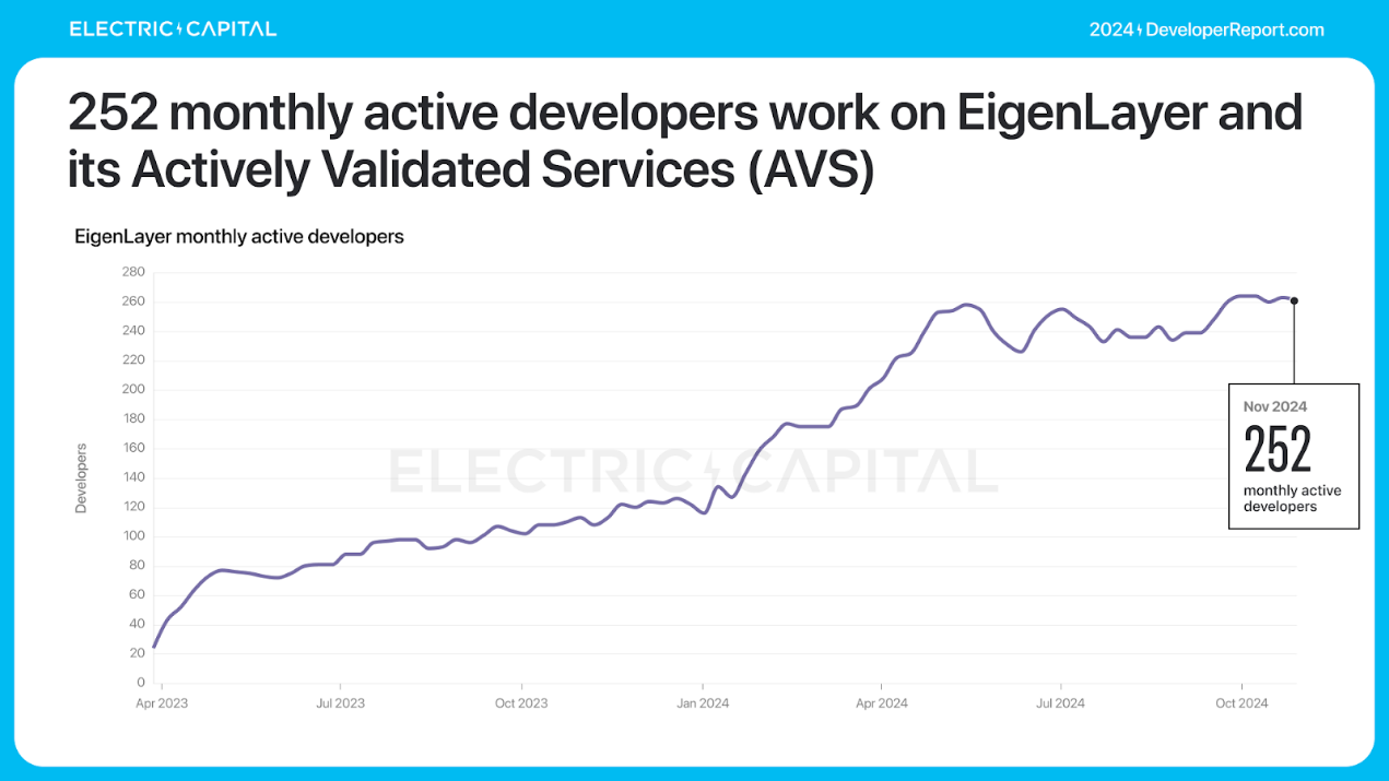 EigenLayer生态系统中每月有252名活跃开发者。EigenLayer开发者们都十分投入:39%是全职开发者,超过一半的开发者在该生态系统中工作了2年以上。