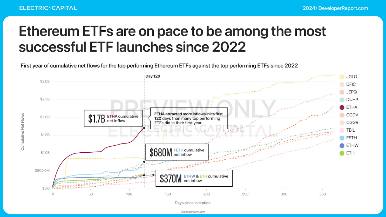 比特币和以太坊ETF今年推出,让链下资本可以轻松访问链上资产。比特币ETF吸引了超500亿美元的净流入,成为有史以来最成功的ETF之一。