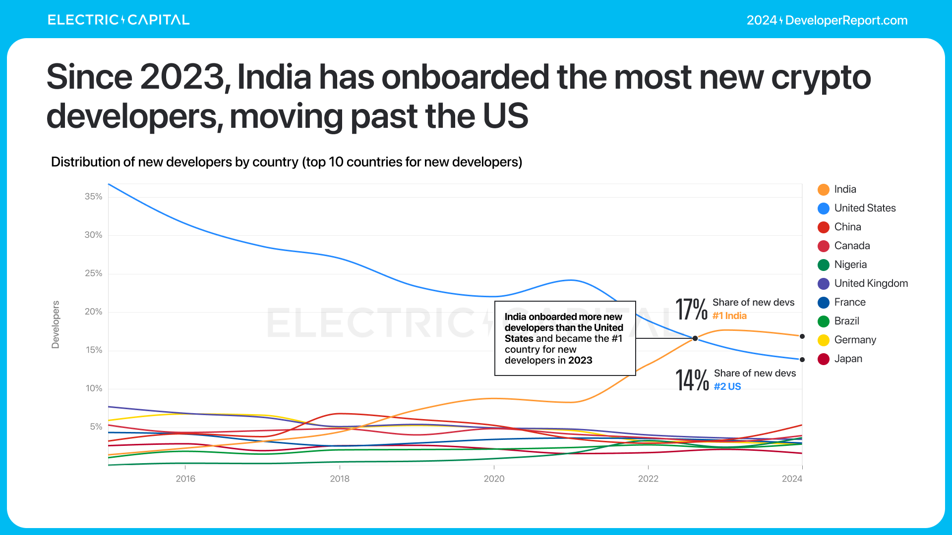 美国在加密开发者份额方面仍然位居第一,但自2015年以来持续下降。印度从第10位跃升至第2位。