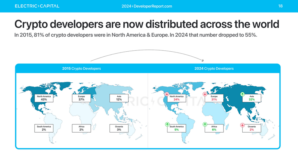 2015年,81%的加密开发者在北美和欧洲,2024年下降到55%。
