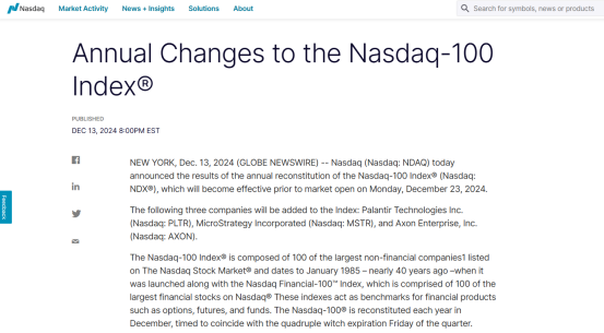 12月14日,据纳斯达克官方显示,MicroStrategy(MSTR) 已正式被纳入纳斯达克100指数,以超过980亿美元的市值成为纳斯达克 100 指数中第40大公司。同时添加的企业还有数据分析公司Palantir Technologies、泰瑟枪制造商 Axon Enterprise,而基因测序设备商 Illumina、AI服务器制造商Super Micro Computer 和疫苗制造商 Moderna则被移除,新指数将于12月23日市场开盘前生效。