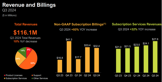 对此,RIA Advisors 的投资组合经理 Michael Lebowitz 就直言,“这本质上是一家没有比特币就会死的企业。”财报也确实如此显示,根据其Q3财报,2024财年前三财季累计收入3.43亿美元,去年同期累计收入为3.72亿美元,同比减少7.81%,在2024财年前三财季累计净亏损4.96亿美元。而从软件业务来看,Q3软件业务总收入仅为1.161 亿美元,同比下降10.3%。