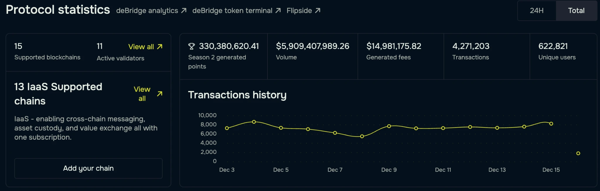 最近一段时间的交易量增长表明,市场对跨链技术的需求持续上升,deBridge 已经成为这一增长的受益者和推动者:新增用户开始活跃使用协议,增加了协议的实际利用率