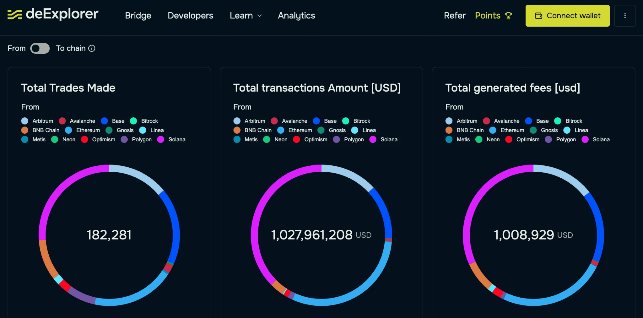 90% 的 Solana 大额跨链资金通过 deBridge 完成,这表明其技术能力已获得高价值交易用户的信任。这一趋势显示了 deBridge 在 Solana 生态中不可替代的角色,尤其是在服务高净值用户和机构方面的竞争优势。同时也证明了协议在处理大额交易时的稳定性、安全性和高效性。