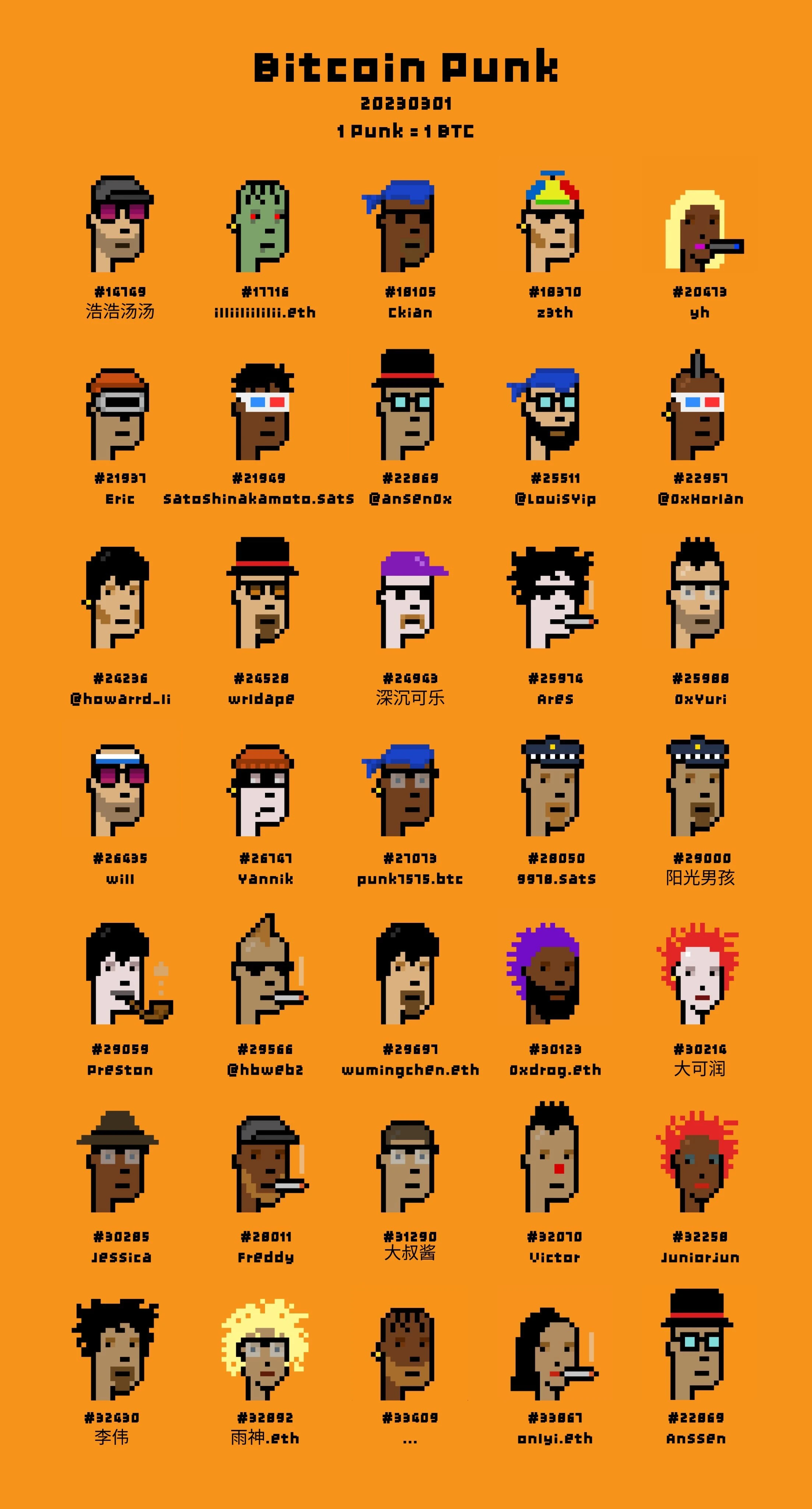 这个时候,加密朋克(CryptoPunks)社区的 holder 发起了在 Ordinals 上铭刻 Bitcoin punks 的活动,自己下载 CryptoPunks 的像素图片去铭刻。