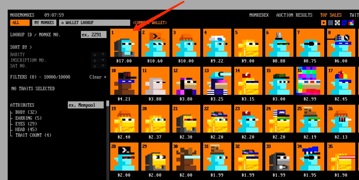 在 12 月底,一个叫 @nodemonkes ( 节点猴)的项目开始以荷兰拍的形式发售,改变了 BTC 生态 NFT 的格局。Nodemonkes 节点猴铭文编号在 83522-111319 ,比特币青蛙的编号在 321224-412389 ,人们发现节点猴才是比特生态第一个原创 10 K 合集。