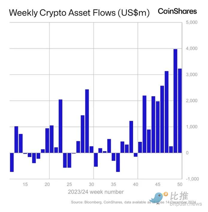 全球加密货币基金持续受到机构投资者的青睐,资金流入量创下历史新高。 根据 CoinShares 的数据,过去四周,全球加密货币基金持续录得净流入,总额达到 32 亿美元。这一积极趋势使得今年迄今为止的总流入额达到了 445 亿美元,是此前任何一年的四倍以上。