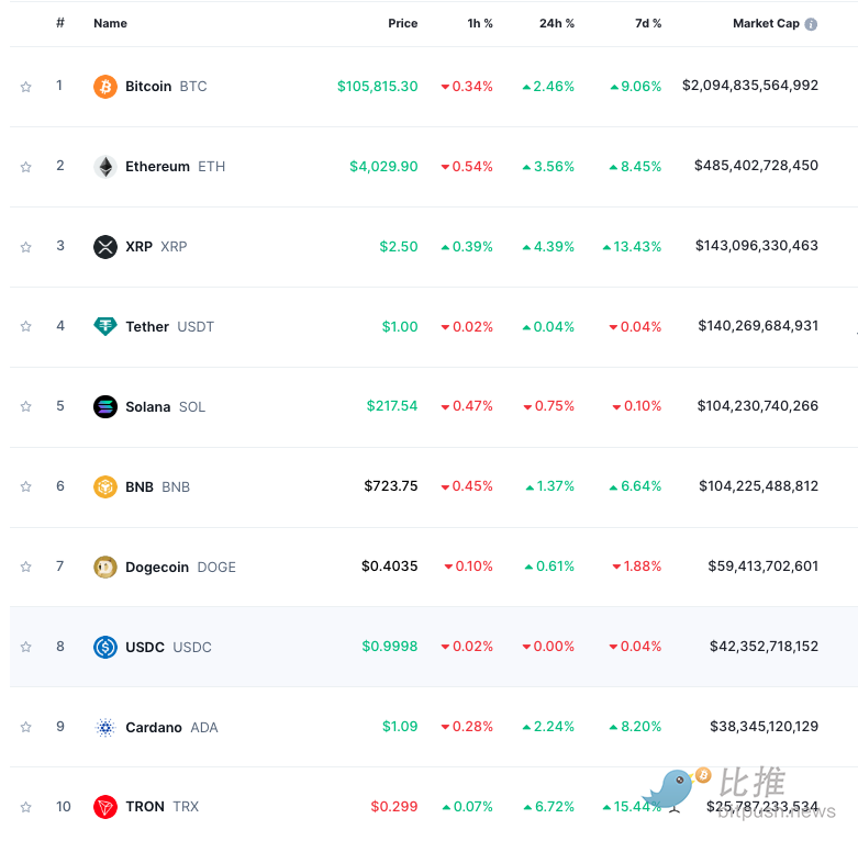 截至发稿时,比特币涨势略有回落,目前价格为 105,815 美元,当日上涨近 3%,周涨幅为 9%。ETH 为 4,029 美元,当日上涨超过 3%,但仍比 2021 年 11 月创下的 4,878 美元的历史高点低 16%。加密货币总市值为 3.7 万亿美元,过去 24 小时内上涨了 2.97%。