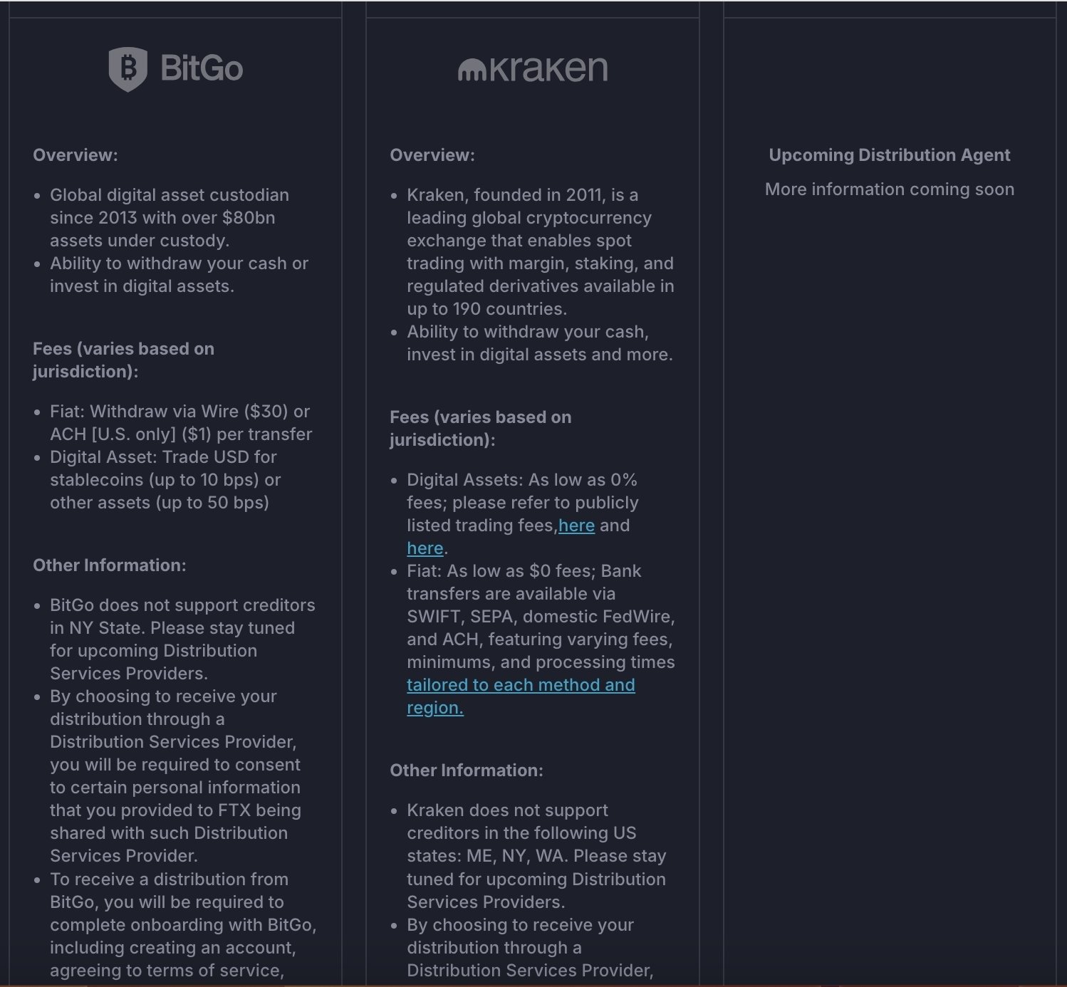 值得注意的是,FTX 还宣布已与 BitGo 和 Kraken 两家公司达成协议,这两家公司将作为第三方分配服务提供商,协助 FTX 根据破产计划向客户和其他债权人分配还款。