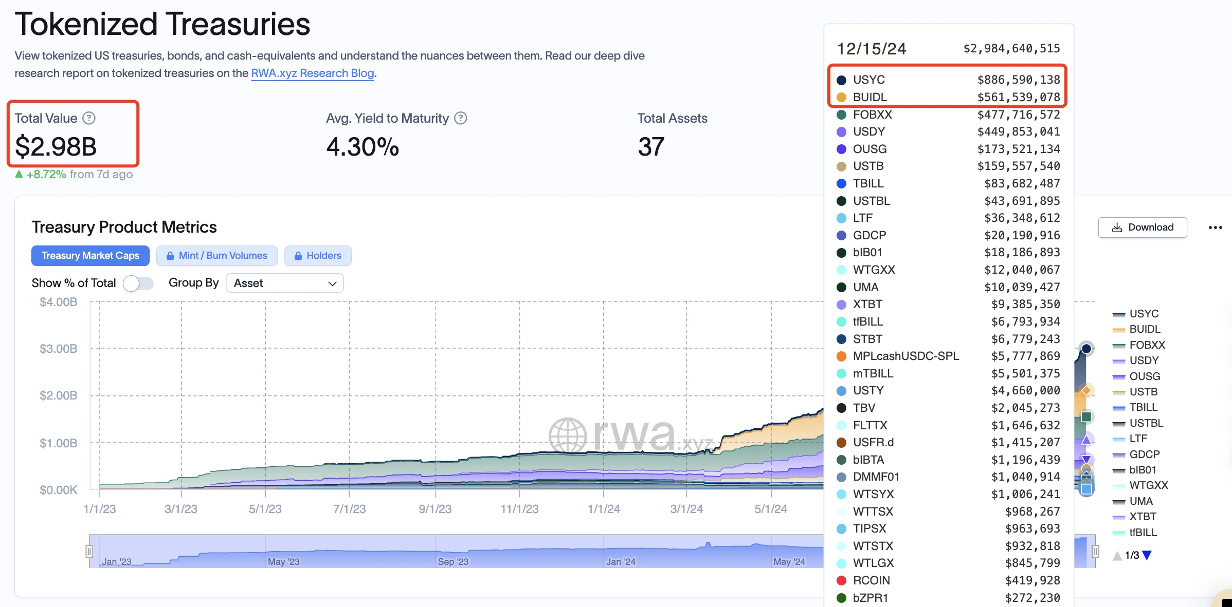 美国国债 RWA 市场目前规模已接近 30 亿美元左右,相较 2023 年初的 1 亿美元增长了近 30 倍,其中,由 Hashnote 与加密货币托管公司 Copper 合作推出的 USYC 规模已达 8.8 亿美元;贝莱德推出的 BUIDL 规模已达 5.6 亿美元。