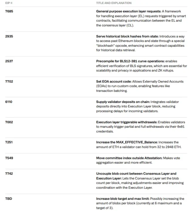 Pectra 升级原本计划成为以太坊历史上规模最大的升级,包含 20 个 EIP。经过与 Fusaka 的拆分后,预计第一次硬分叉将包含 10 个 EIP。我们不会逐一详细讨论这 10 个 EIP,而是将重点关注其中最重要的一个,并解释为什么要实施它。完整的 EIP 列表如下所示: