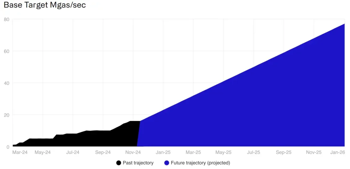 除了前面提到的大型机构推动二层网络的机构化外,还有其他因素表明我们的预测可能会成真。例如,由加密巨头 Coinbase 支持的二层网络 Base,已经透明地概述了他们的计划,即每周将 gas 目标提高 1 Mgas/sec,直到达到 1 Ggas/s。简而言之,Base 的计划是持续增加每个区块可以容纳的交易量,因此也会增加以太坊本身(作为批量交易)所能容纳的交易量。