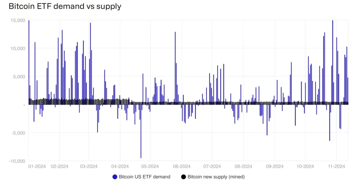 比特币 ETF 需求与供应。来源:Bloomberg, CoinShares, data available as of close 23 November 2024