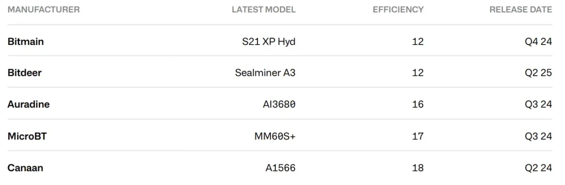 横坐标依次为:制造商、最新型号、效率、发布日期。来源:CoinShares, ASIM Miner Value, company data (as of 16 October 2024)