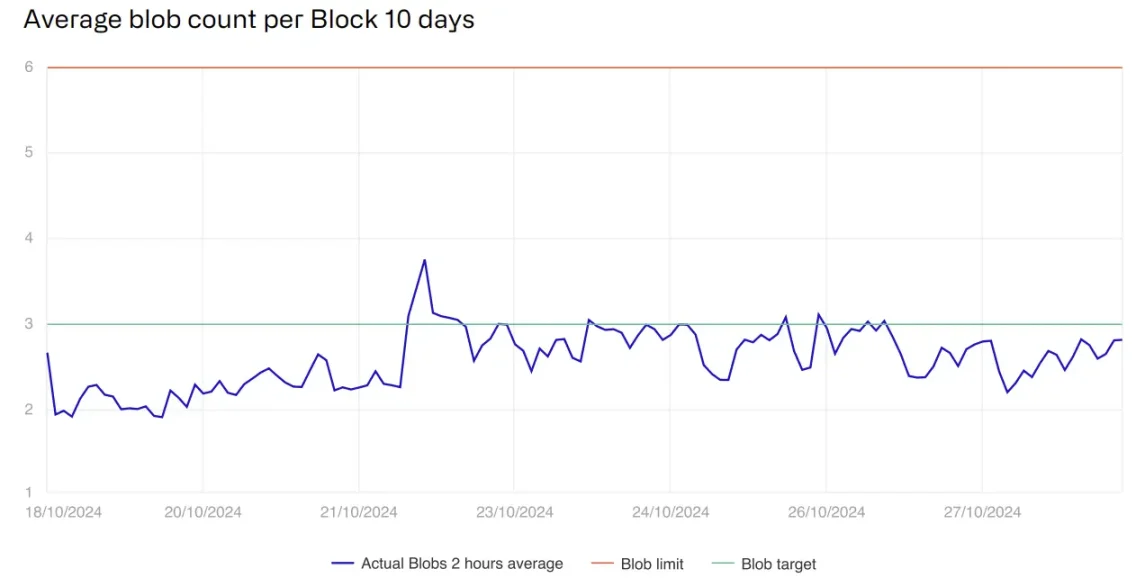 每个区块的平均 Blob 数量(过去 10 天)。来源:Dune Analysis, data as of 25th November 2024