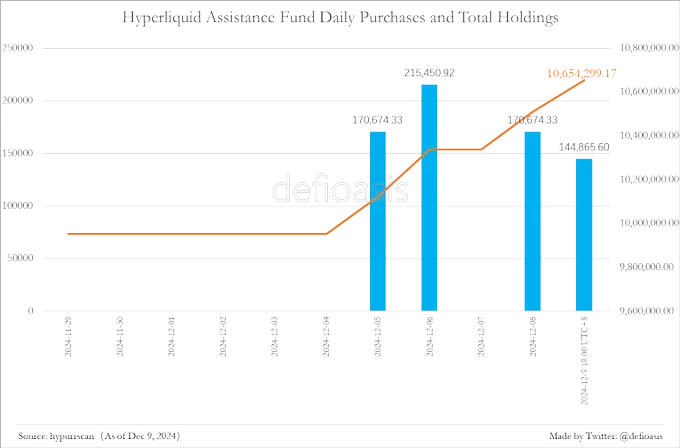 Hyperliquid Assistance Fund 的资金主要来自于 Hyperliquid 平台的合约交易收入,即 USDC 费用的一部分会进入这个基金,用于支持平台的各种活动,主要包括 HYPE 代币的回购。根据 hypurrscan 浏览器,在 12 月 5 日至 12 月 9 日 19: 00 UTC+ 8 ,Assistance Fund 从二级市场回购了 567, 083.22 枚 HYPE,回购价值为 7, 364, 369.45 美元,均价约为 12.99 美元。