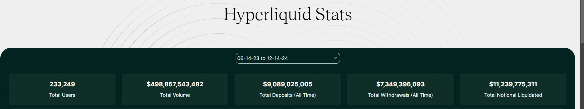 整体数据:截止 12 月 14 日 HyperLiquid 的总用户数已经达到 23 w,总的交易量达到 5000 亿美金。
