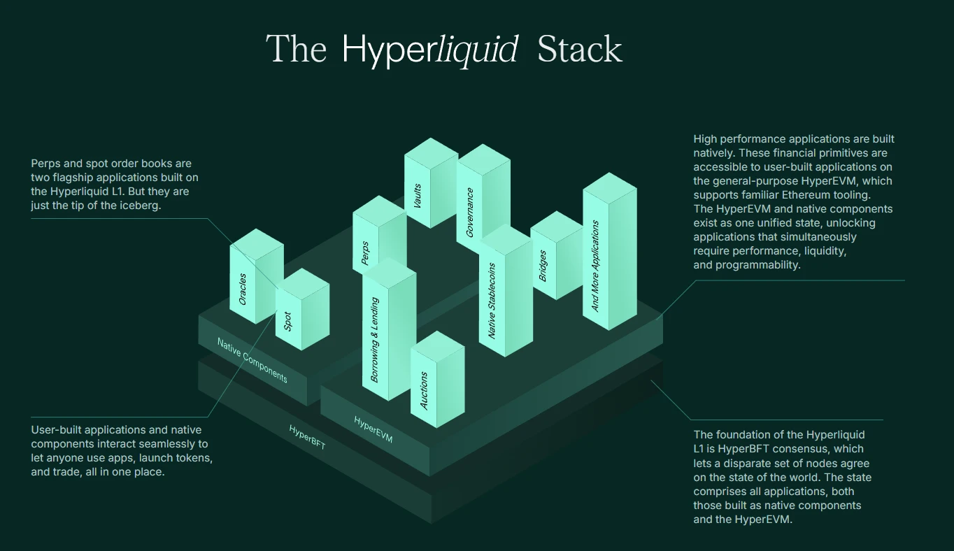 HyperEVM 支持: Hyperliquid 支持一个增强的 EVM,允许开发者在其上构建各种 DeFi 应用,同时能与原生组件无缝对接。