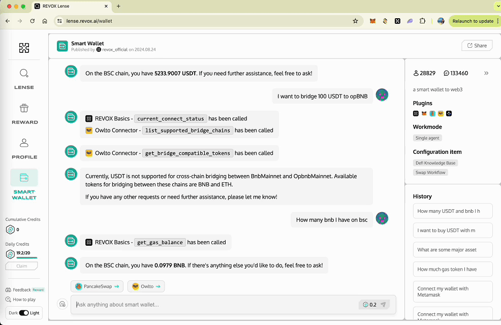 REVOX Lense 更像是 “Web3 版 GPT”,为链上资产提供一站式信息整合与分析。目前 REVOX Lense 已吸引 1700 万用户,为 opBNB 上最大 dApp。REVOX Lense 可以与用户的钱包无缝集成,自动识别资产并展示与钱包资产相关的高质量新闻、社交媒体趋势和讨论。通过综合钱包数据,REVOX Lense 还将信息汇总为综合报告,为用户提供其资产表现、市场情绪和潜在未来趋势的整体视图。还可以解答用户在现有市场上遇到的投资问题,提供专业的回答,帮助用户对其资产组合做出明智的决策。
