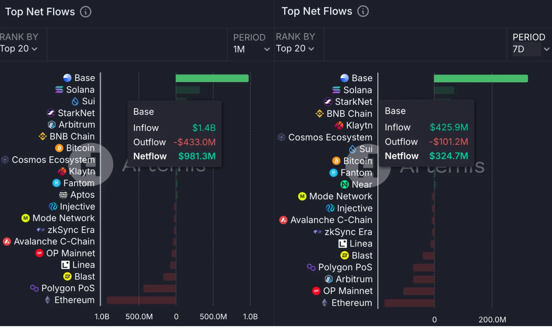 Base 在 Coinbase 和北美资本的大力支持下,Base 生态在 2024 年经历了爆发式增长。11 月,资本流入量超过了 Solana,并且在过去 7 天内大幅超过了 Solana。