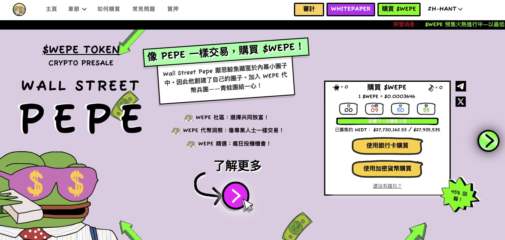 与以太坊稳健的技术支撑不同,迷因币市场以其爆发力和病毒式传播再次引发狂潮。Wall Street Pepe($WEPE)作为一款结合迷因文化和反叛精神的代币,预售成绩惊人,在48小时内迅速从400万美元增长至2800万美元,震惊市场。