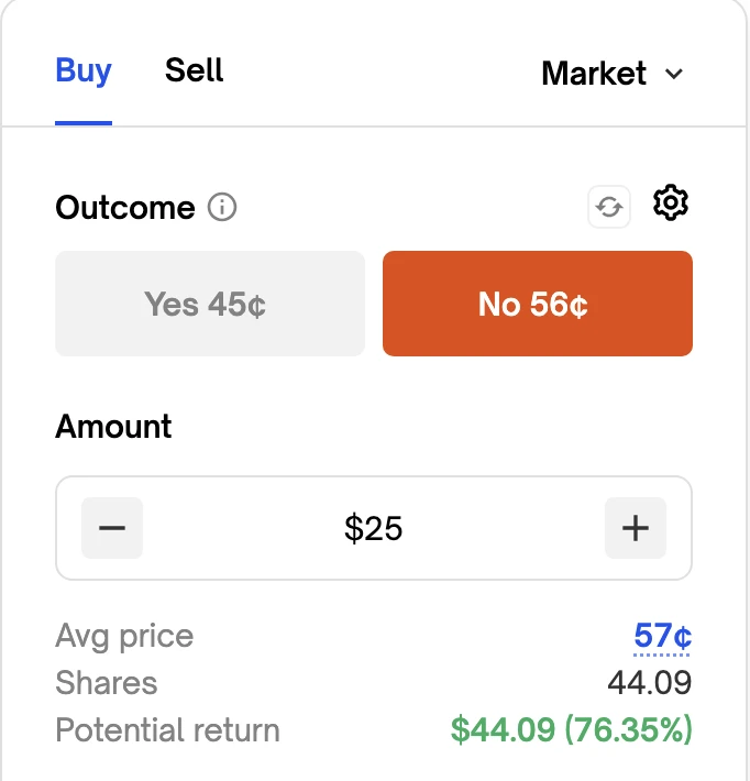 买入$ 25 的"否"合约, 以 46 美分的价格购买 ETH 低于$ 3, 900 的合约。