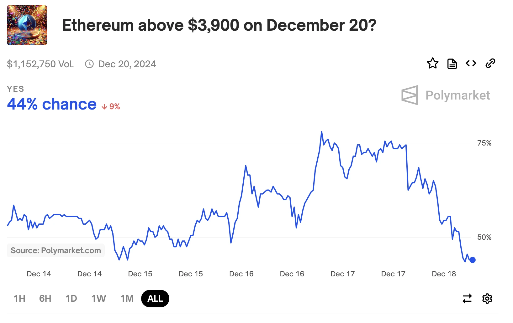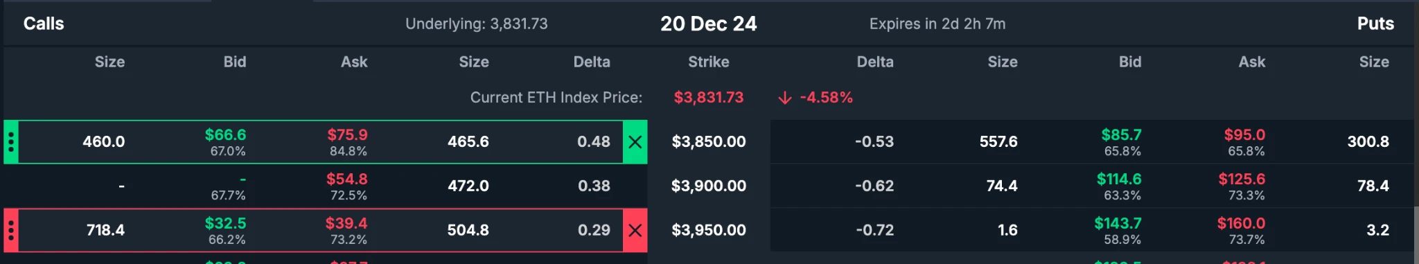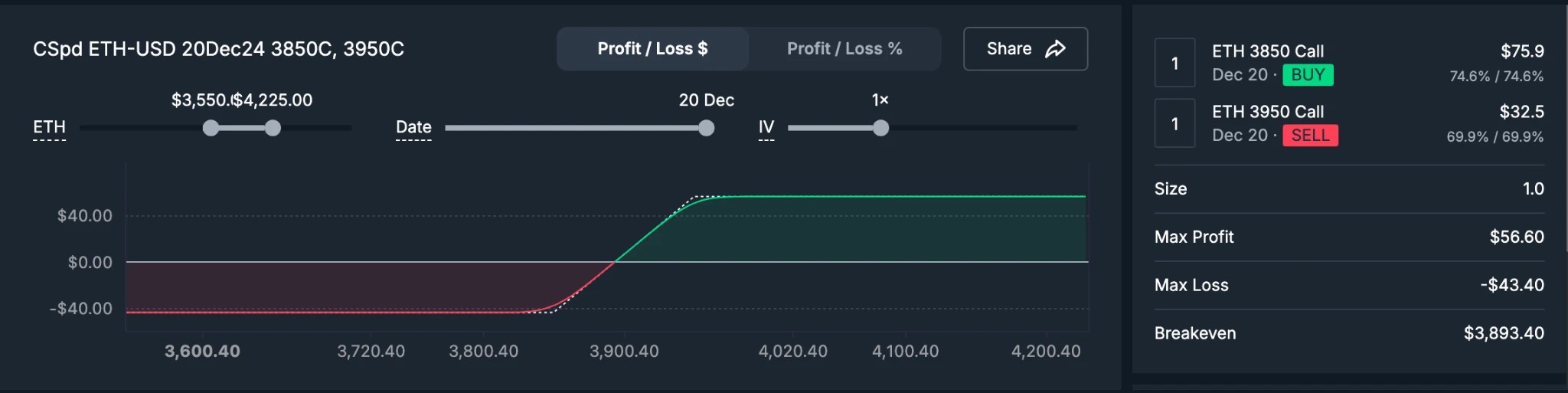 潜在回报: 如果 ETH 在 12 月 20 日保持低于$ 3, 900 ,则预计回报为$ 44.09 。