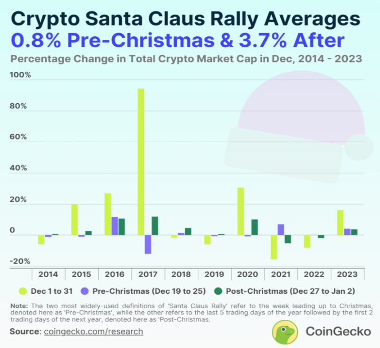 从 2014 年至 2023 年,加密市场在圣诞节后的「圣诞老人行情」中有 8 次在 10 年内出现,总加密市场市值在 12 月 27 日至次年 1 月 2 日的一周内上涨了 0.69% 至 11.87%。这一现象借鉴了耶鲁·赫希(Yale Hirsch)的定义,他被认为是「圣诞老人行情」一词的提出者,原指每年最后五个交易日和次年头两个交易日的市场表现。