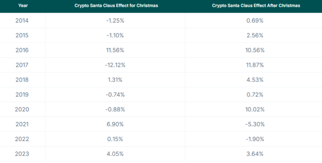 比特币历年「圣诞老人效应」数据,基于比特币价格在每个特定时间段内的每日百分比变化: