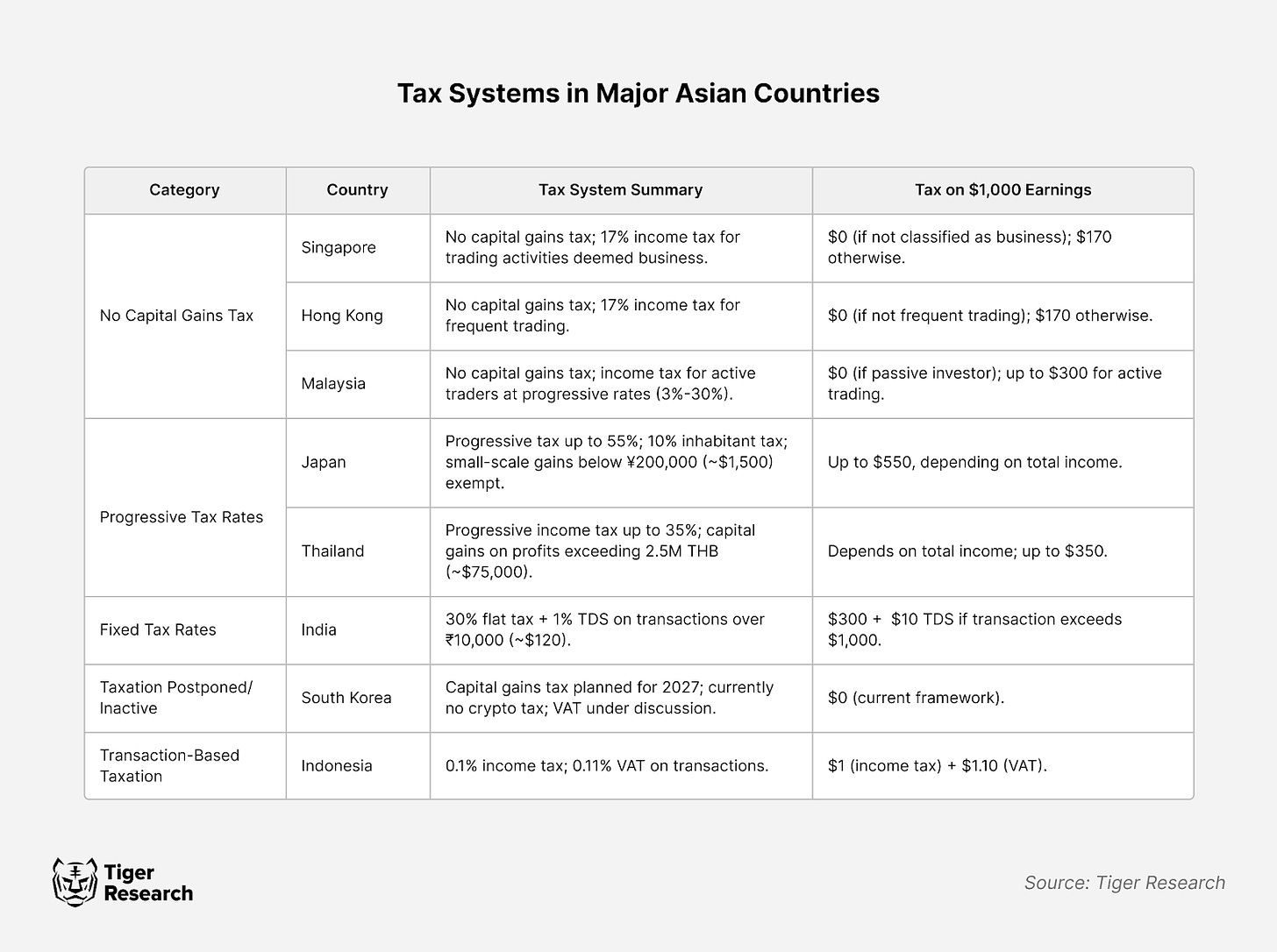 对亚洲主要国家的加密货币税收制度进行分析,可以发现五种不同的政策类型。这些差异反映了每个国家的经济结构和政策重点。