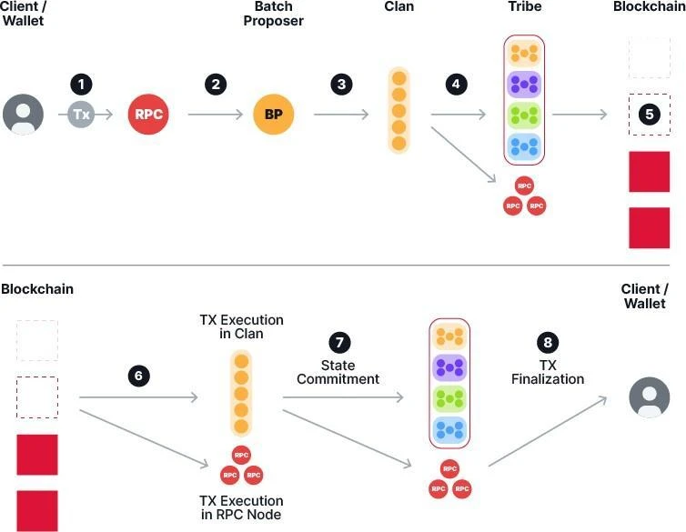 批次通过 xRBC 协议传播到相应的执行氏族节点,必须形成数据可用性仲裁证书(DAQC)后,批次才能被包含到区块中。这些证书会传播到整个部落,批次也会传播到网关 RPC 节点。
