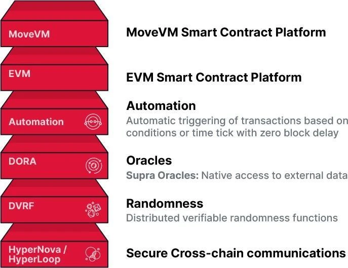 Supra 将多年来的多项创新成果集成到一个强大且高性能的架构中,该架构完全垂直集成了 MultiVM 智能合约支持和原生服务,包括价格预言机、链上随机数、跨链通信以及自动化功能。