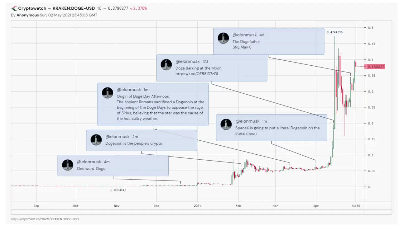 真正让狗狗币声名鹊起的是特斯拉和 SpaceX 的首席执行官马斯克, 2021 年,马斯克发推称:“狗狗币可能是我最喜欢的加密货币”并频繁提及,在此人巨大的号召力下,狗狗币在当年成为表现最佳资产并与其深度绑定,间接延长了狗狗币的寿命,此后每当马斯克发布推文时,狗狗币的价格就会随之上涨。