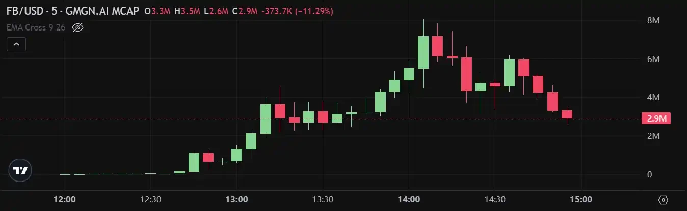 FB,FartBird,叙事与 UFD 类似,发币人 63 岁,也是以「老人发新币」为卖点吸引目光,同时凭借代币名称与 FaceBook 相同缩写「FB」的巧合为噱头进行宣传。该代币一经发布,市值迅速拉升,在两小时内达到 7.87 M,后续市值开始回落,目前在 2 M 左右波动。