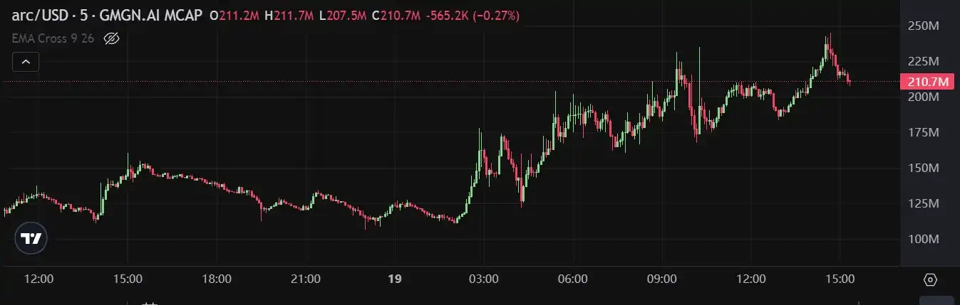 19 日凌晨,ARC 市值开始上涨,并且保持了强势的增长势头。同时,在昨夜美联储最新议息会议公布基准政策利率下调 25 个基点,声明中的鹰派措辞和经济预测的调整对市场情绪产生了负面影响,比特币、以太坊、Solana 以及山寨币价格均明显下跌,ARC 在大盘下跌的趋势中步步维稳突破前高至 244.6 M,并保持强势的增长动力,表现极为亮眼。
