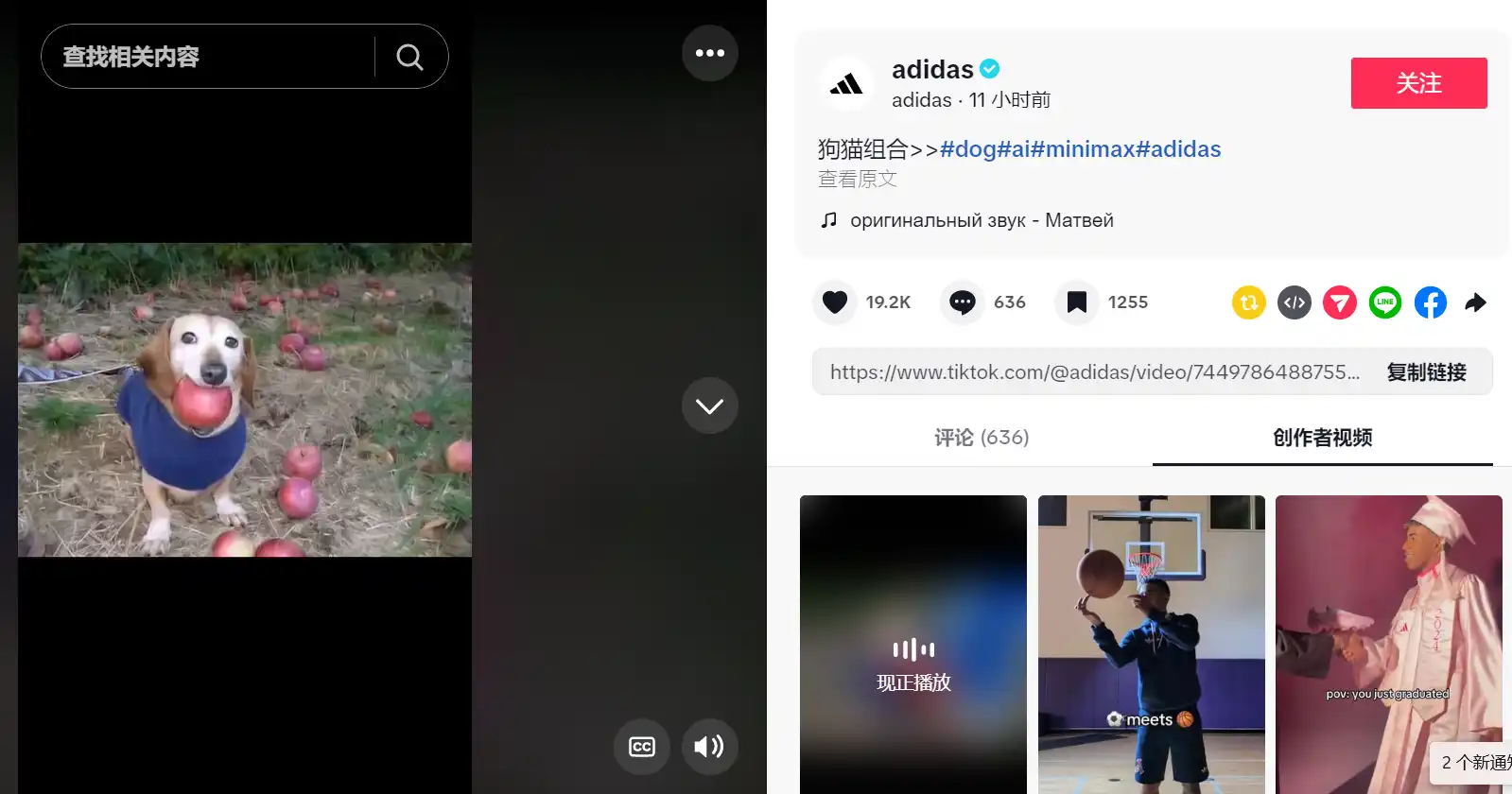 APPLE(dog with apple in mouth)属于 TikTok 爆火概念,a16z 联创 Marc Andreessen 曾转发 APPLE 关联概念的创作视频,苹果狗依托 TikTok 平台的巨大影响力,形成病毒式传播,极大地提升了 meme 代币的热度。19 日凌晨,adidas 在 TikTok 发布了一段 5 秒的苹果狗视频,推动了 APPLE 价格的迅速拉涨,又引领了一波 AI 二创可爱苹果狗视频的热潮。