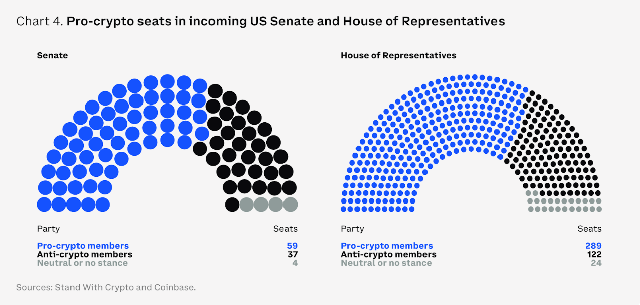 在与监管模糊性斗争多年后,美国下届立法会议可能会提升加密行业监管清晰度。这次选举向华盛顿发出了一个强烈的信息,即公众对当前的金融体系不满,希望变革。从市场的角度来看,众议院和参议院两党都支持加密货币,这意味着美国的监管可能会在 2025 年从“逆风”转向“顺风”。